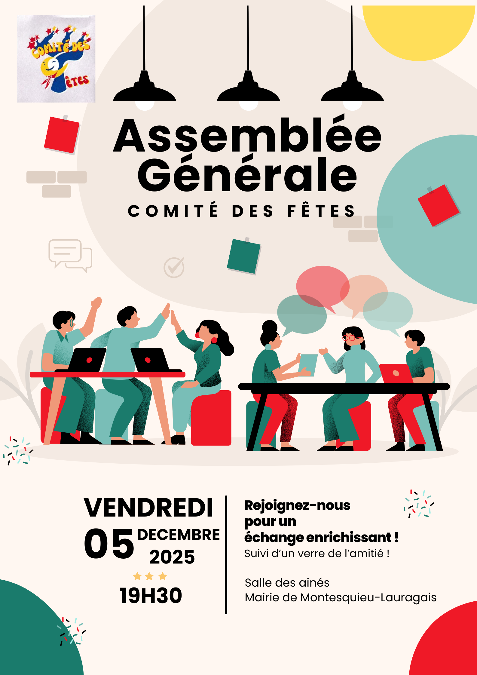 Assemblée GénéraleVendredi 05 décembre 2025Le Comité des Fêtes du village vous invite à son assemblée générale (AG) qui se tiendra à la salle des ainés, à 19h30 Vous trouverez ici l'affiche. |