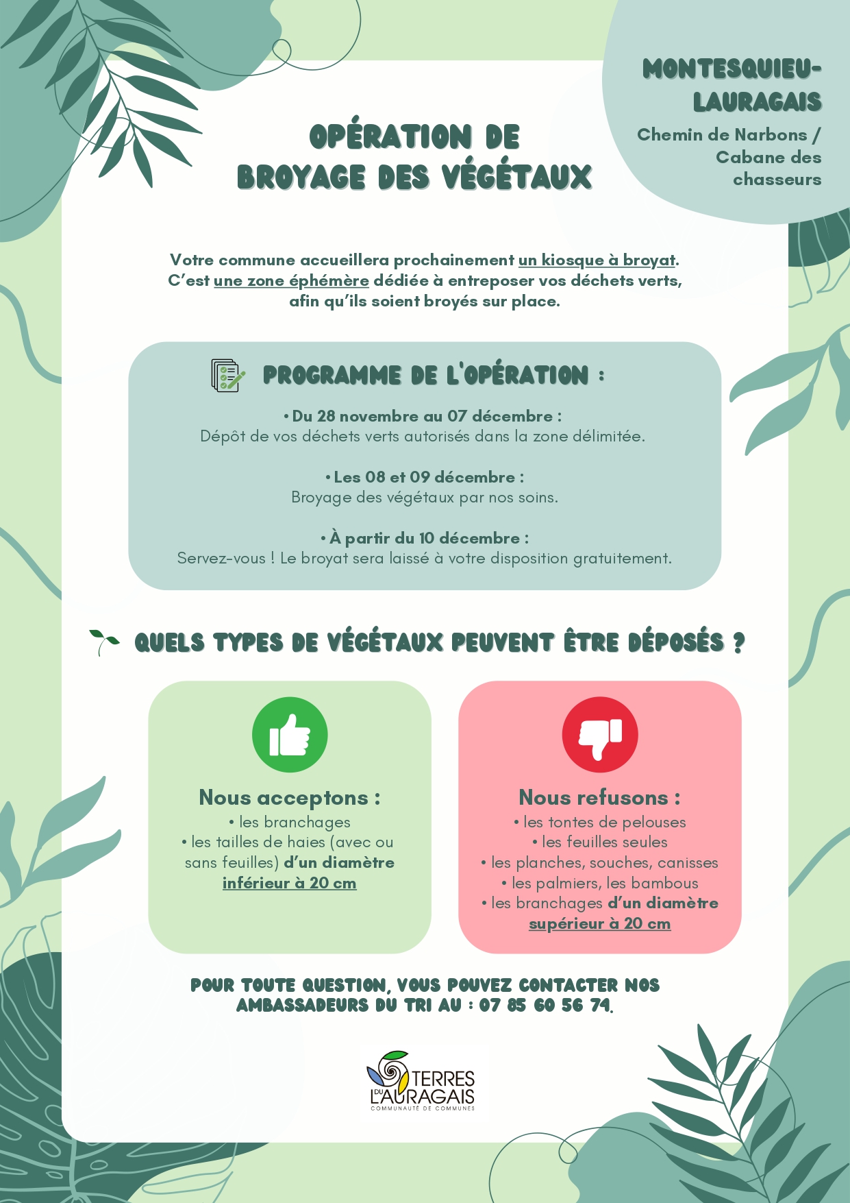 🌿 Opération de broyage des végétaux🌿À partir du vendredi 28 novembre 2025Votre commune accueillera prochainement un kiosque à broyat — une zone éphémère spécialement dédiée à la collecte et au broyage de vos déchets verts. Profitez de cette opération pour valoriser vos branchages et repartir avec du broyat à utiliser dans votre jardin ! 🗓️ Programme de l’opération : Du 28 novembre au 07 décembre : Déposez vos déchets verts autorisés dans la zone délimitée (Chemin de Narbons / Cabane des chasseurs). Les 08 et 09 décembre : Les végétaux seront broyés sur place par nos équipes. À partir du 10 décembre : Servez-vous librement ! Le broyat sera mis à disposition gratuitement pour vos besoins de paillage ou de compostage. 🌱 Quels types de végétaux déposer ? Nous acceptons : - Les branchages - Les tailles de haies (avec ou sans feuilles) d’un diamètre inférieur à 20 cm Nous refusons : - Les tontes de pelouses et feuilles seules - Les planches, souches, canisses, palmiers, bambous - Les branchages d’un diamètre supérieur à 20 cm 👉 Pour toute question, contactez nos ambassadeurs du tri au 07 85 60 56 74. Une initiative de la Communauté de communes Terres du Lauragais, pour un jardinage plus durable et un territoire plus vert 🌍💚 Vous trouverez ici l'affiche. |