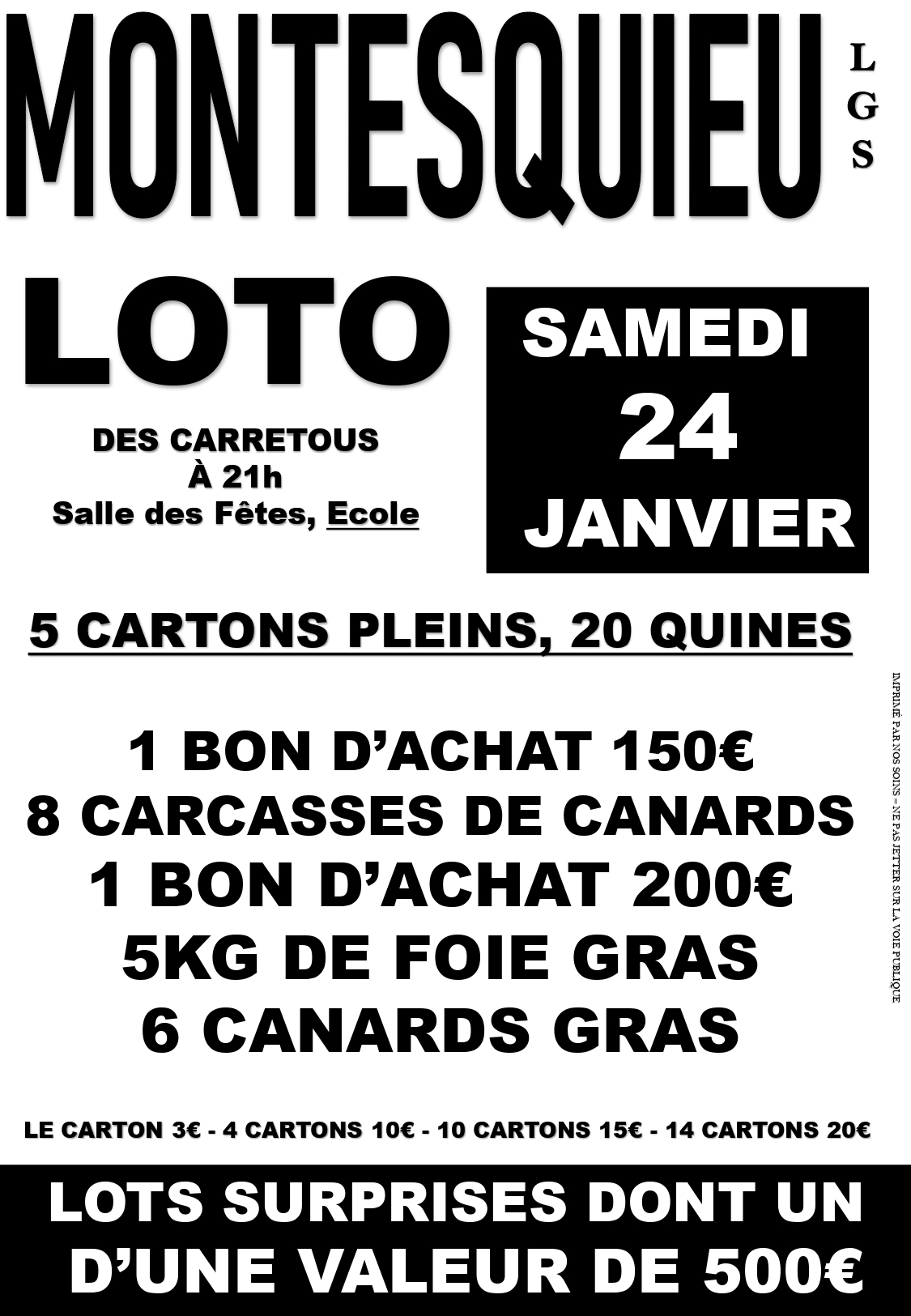 LotoSamedi 24 janvier 2026L'association des Carretous vous propose un loto pour ce début d'année. Au programme, plusieurs lots surprises dont un d'une valeur de 500€. Rendez-vous à la salle des fêtes dès 21h. Infos et réservations ici. |