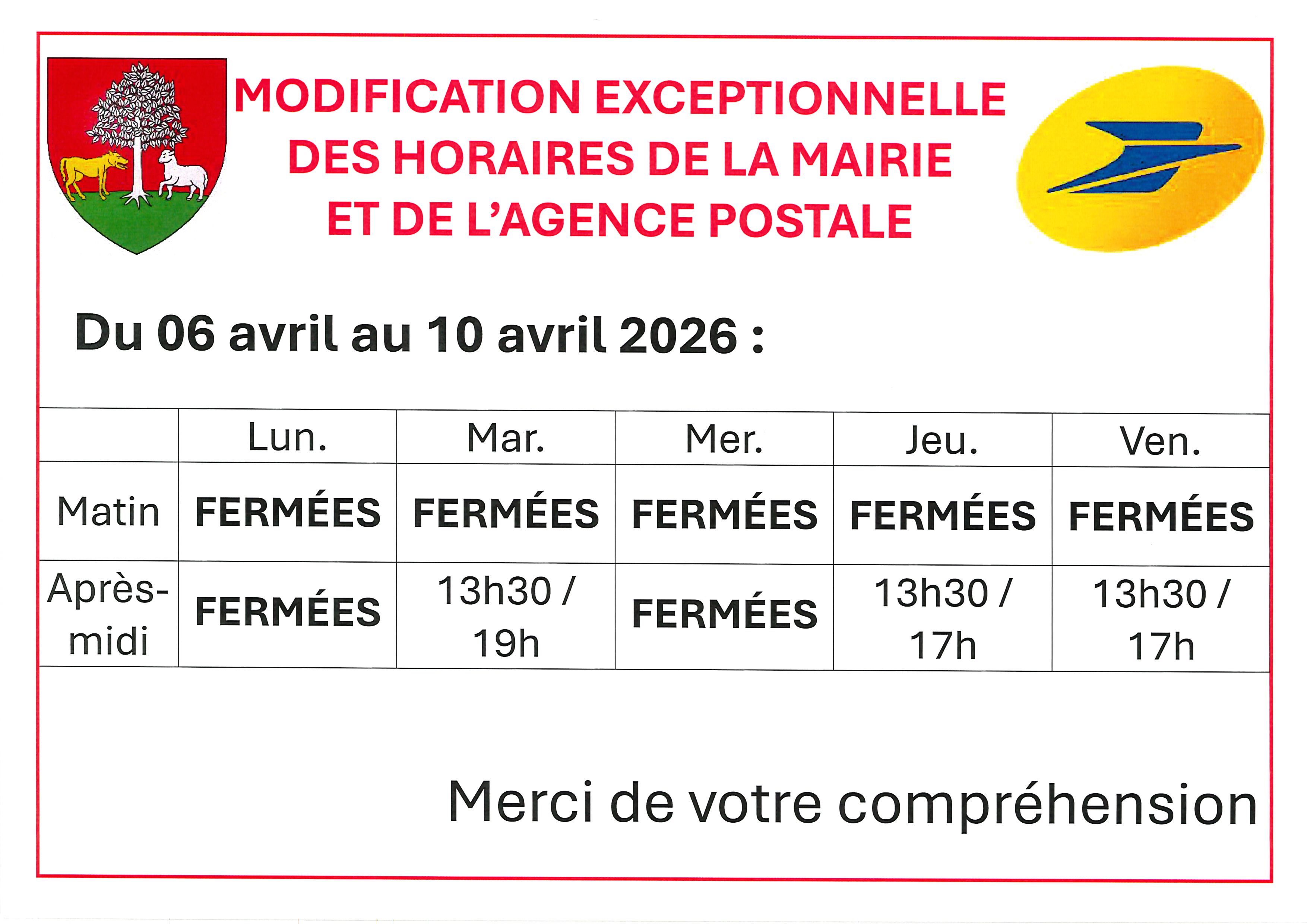 Horaires modifiées de la Mairie et le l'Agence PostaleDu 06 au 10 avril 2026Les horaires du secrétariat et de l'agence postale seront exceptionnellement modifiés comme suit : - Lundi 06 avril : FERMÉES - Mardi 07 avril : 13h30 / 19h - Mercredi 08 avril : FERMÉES - Jeudi 09 avril : 13h30 / 17h - Vendredi 10 avril : 13h30 / 17h |