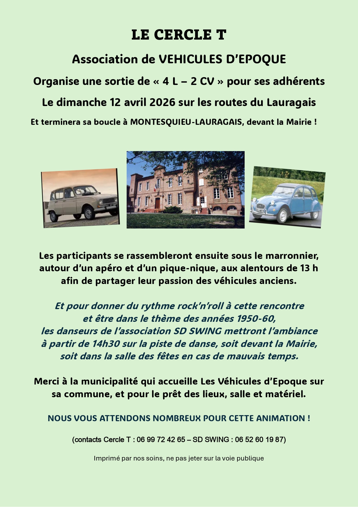 Exposition de voitures anciennesDimanche 12 avril 2026La commune sera le point d'arrivée d'une balade de véhicules anciens. Pour l'occasion, les danseurs de l'association SD Swing enflammeront la piste de danse sur le thème des années 50/60, à partir de 14h30. |