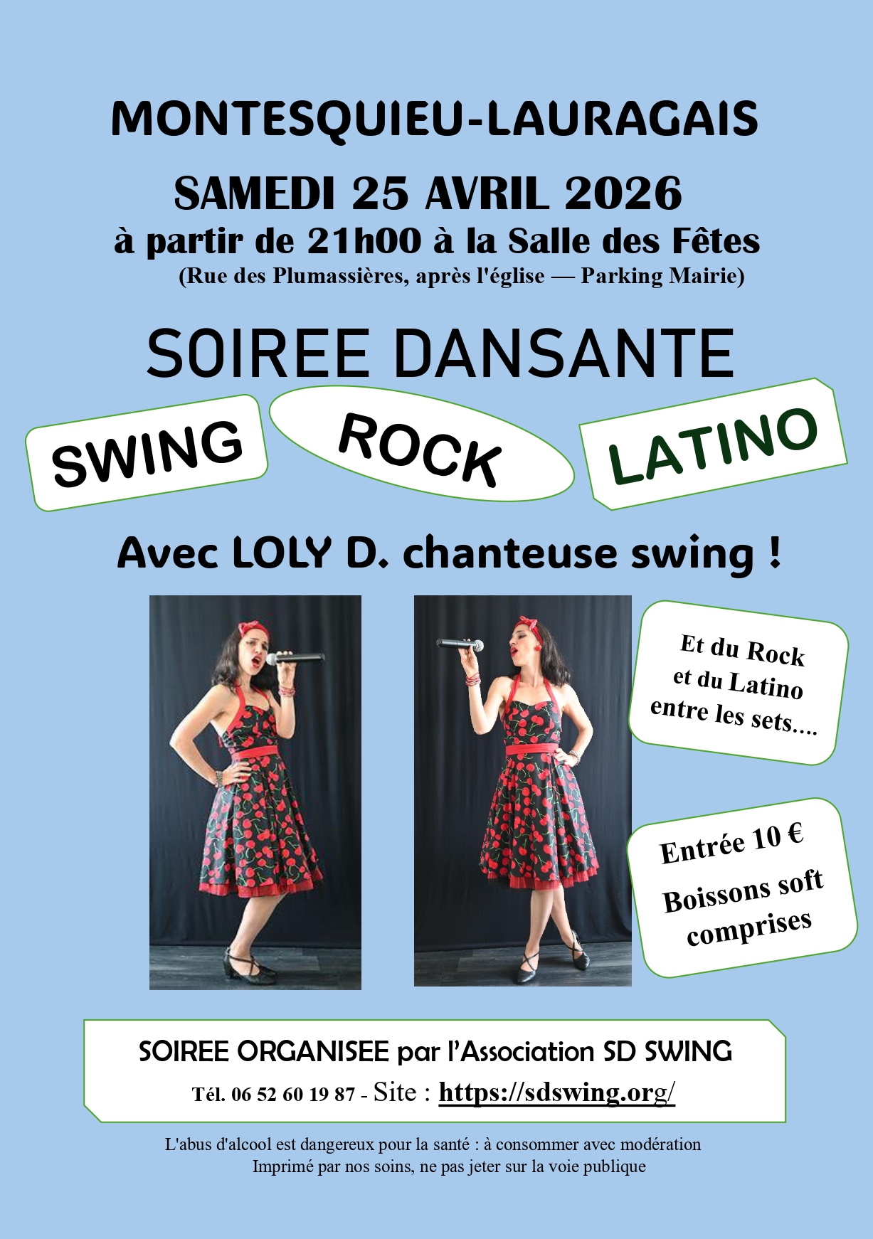Soirée dansanteDimanche 19 avril 2026Venez profiter d'une soirée dansante à la salle des fêtes, animée par l'association SD Swing et la chanteuse swing Loly D., entre swing, rock et latino. |
