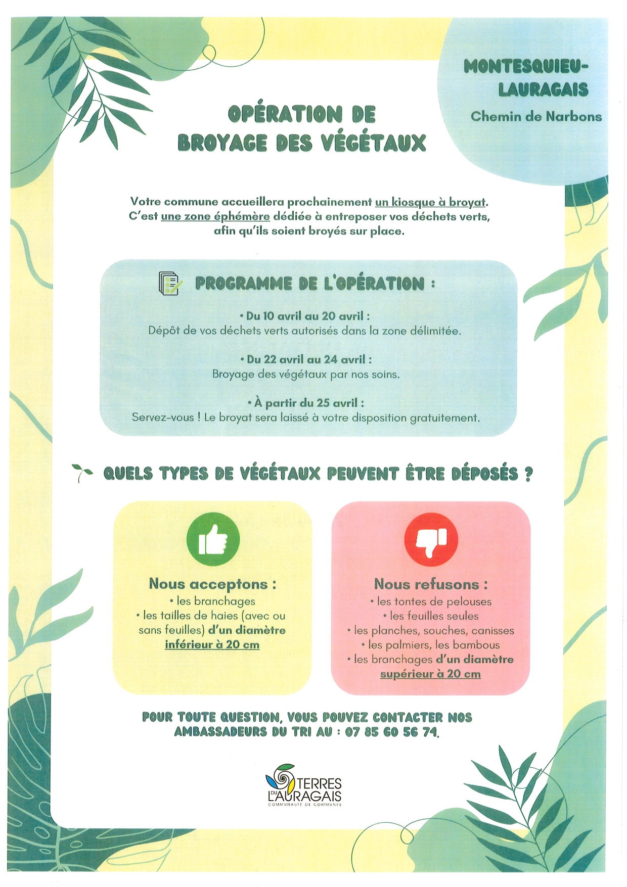 Broyage des déchets vertsDu 10 au 20 avril 2026La Mairie, en partenariat avec la Communauté des Communes des Terres du Lauragais vous propose une nouvelle fois de déposer vos déchets vert près du cabanon de chasse. |