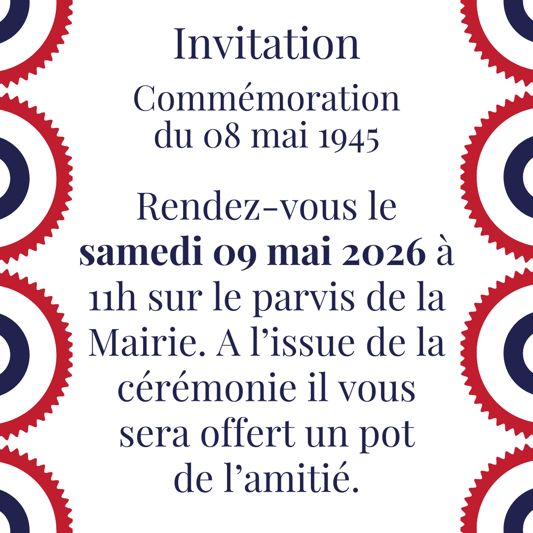 Commémoration du 08 mai 1945Samedi 09 mai 2026Le 8 mai marque une date majeure de notre histoire : celle de la fin de la Seconde Guerre mondiale en Europe en 1945, après près de six années d’un conflit particulièrement meurtrier. Cette journée rend hommage à la victoire des Alliés sur l’Allemagne nazie, mais surtout à toutes celles et ceux qui ont combattu pour la liberté, ainsi qu’aux millions de victimes civiles et militaires de la guerre. Elle est également un moment de recueillement et de transmission, pour ne pas oublier les souffrances endurées et les valeurs de paix, de liberté et de démocratie qui en sont issues. À cette occasion, la commune vous invite à participer à la cérémonie commémorative : À 11h La cérémonie sera suivie d’un moment convivial autour d’un pot de l’amitié. Nous vous attendons nombreux pour partager ce temps de mémoire et de rassemblement. |