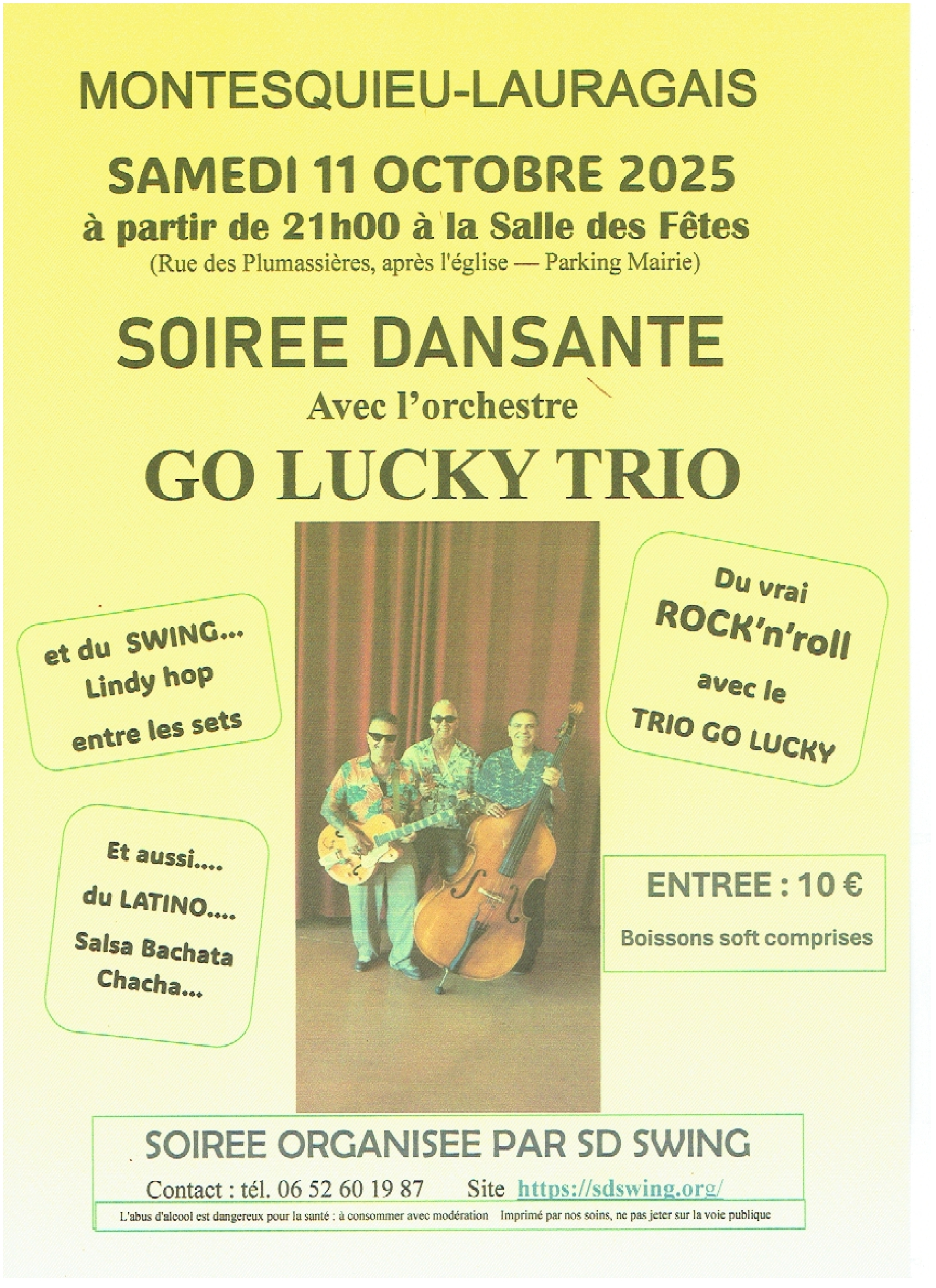 🎶Soirée dansante 🎶Samedi 11 octobre 2025À partir de 21h, rendez-vous à la Salle des Fêtes pour une soirée pleine d’énergie avec l’orchestre Go Lucky Trio ! Au programme : rock’n’roll, swing, lindy hop, mais aussi des rythmes latinos (salsa, bachata, chacha…). Ambiance festive garantie ! 👉 Entrée : 10 € (boissons soft comprises). Soirée organisée par SD Swing. Vous trouverez ici l'affiche. |