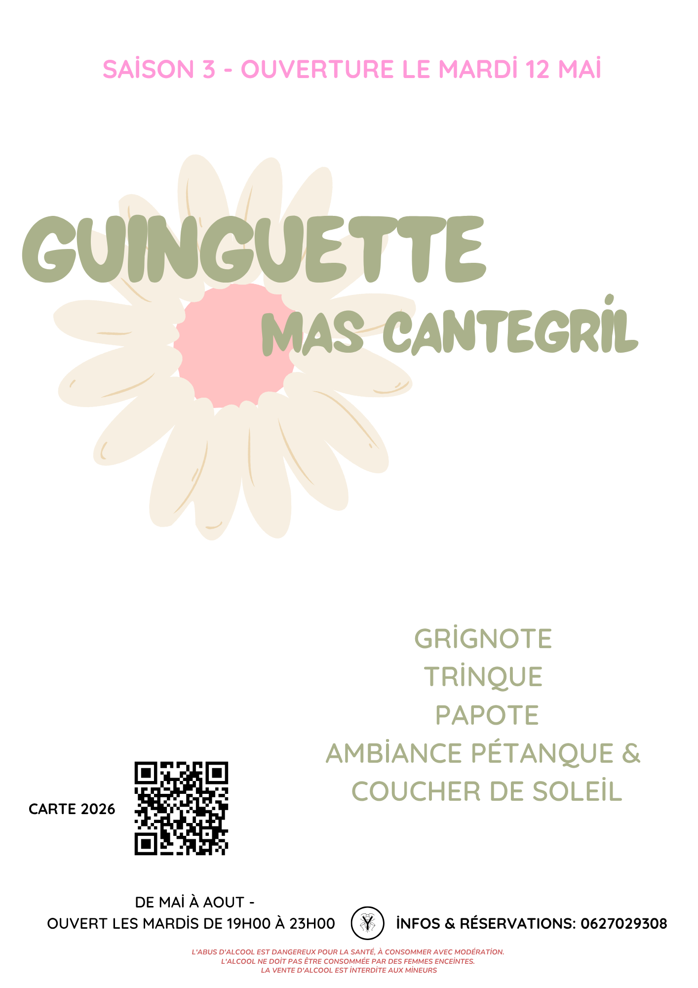 Guinguette du Mas CantegrilMardi 12 mai 2026La guinguette du Mas Cantegril lance sa saison 3 et vous donne rendez-vous à partir du mardi 12 mai pour une nouvelle saison placée sous le signe de la convivialité. De mai à août, tous les mardis de 19h à 23h, venez partager un moment chaleureux en famille ou entre amis dans un cadre agréable. Au programme : restauration sur place, boissons, échanges, détente et ambiance estivale avec pétanque et coucher de soleil. Un lieu idéal pour se retrouver, se détendre et profiter des belles soirées d’été dans la commune. Les réservations sont recommandées au 06 27 02 93 08 |