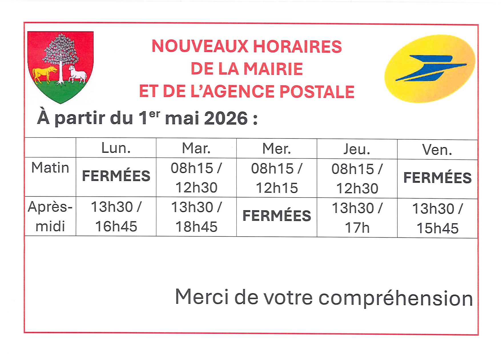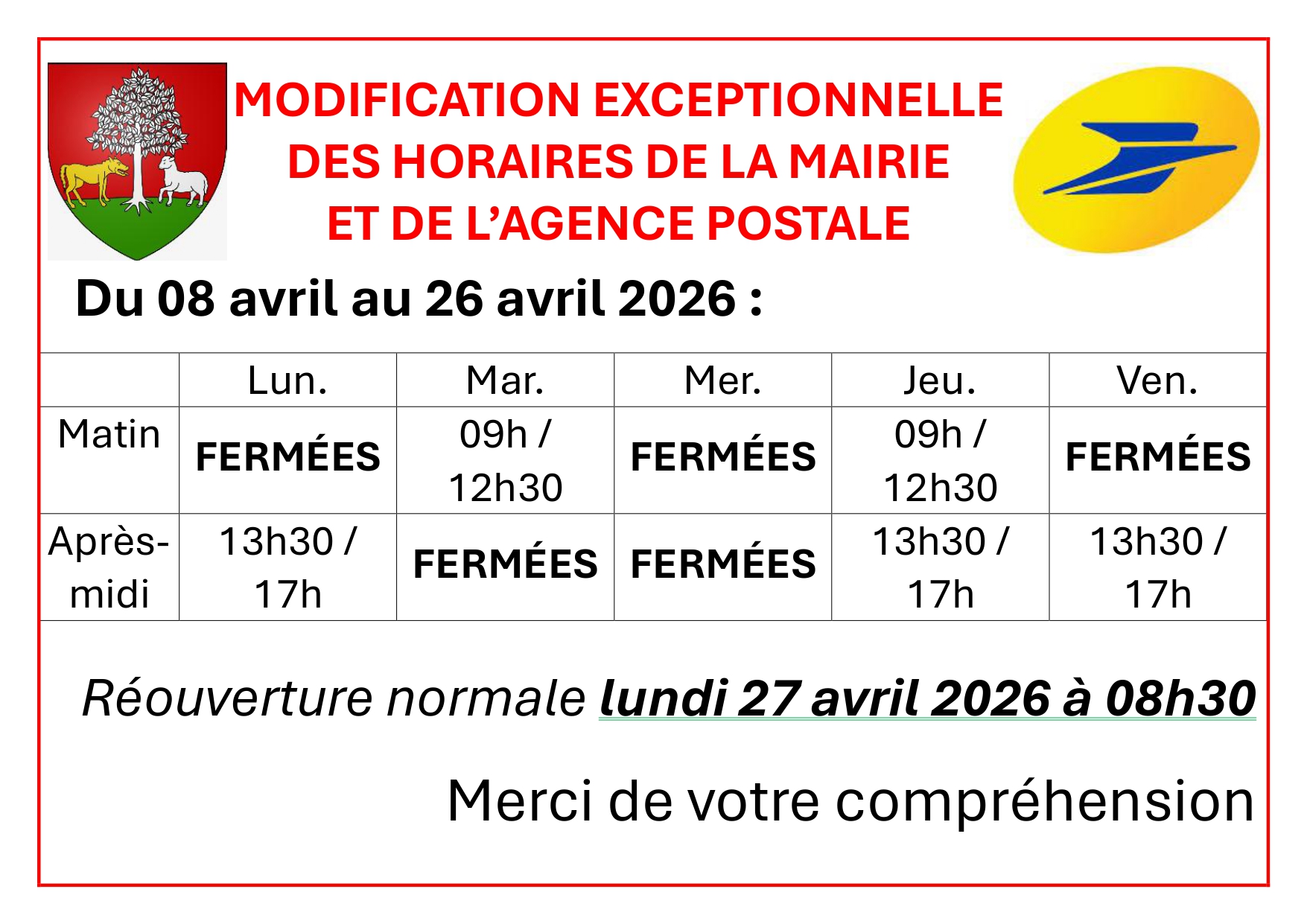 Horaires modifiées de la Mairie et le l'Agence PostaleDu 13 au 26 avril 2026Les horaires du secrétariat et de l'agence postale seront exceptionnellement modifiés comme suit : - Lundi : 13h30 / 17h - Mardi : 09h / 12h30 - Mercredi : FERMÉES - Jeudi : 09h / 12h30 et 13h30 / 17h - Vendredi : 13h30 / 17h |