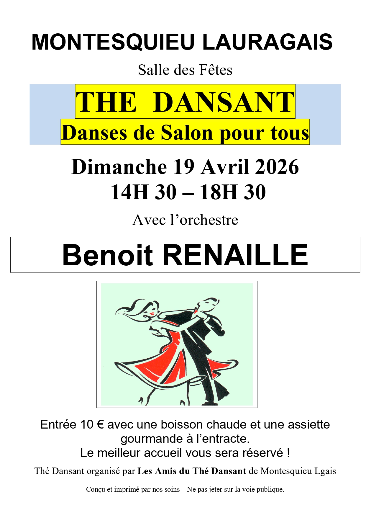 Après-midi dansanteDimanche 19 avril 2026Profitez d'un thé dansant à la salle des fêtes avec l'orchestre de Benoît Renaille, pour un après-midi placé sous le signe des danses de salon avec l'association des Amis du Thé Dansant. |