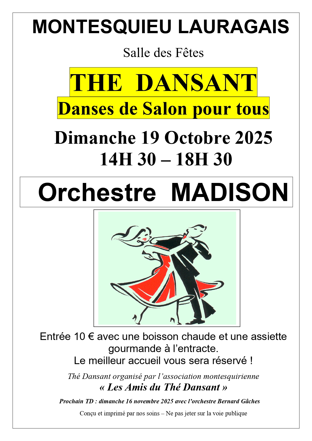 🎶Après-midi dansante 🎶Dimanche 19 octobre 2025L’association Les Amis du Thé Dansant vous invite à partager un après-midi festif et convivial à la Salle des Fêtes, de 14h30 à 18h30. Au programme : ☕ Entrée : 10 €, incluant une boisson chaude et une assiette gourmande servies à l’entracte. Venez danser, échanger et profiter d’un moment de bonne humeur ! Vous trouverez ici l'affiche. |