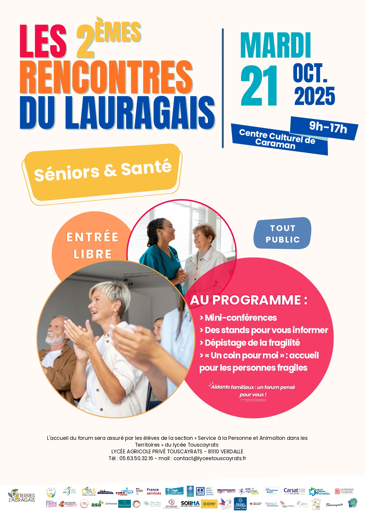 Les 2ᵉ Rencontres du LauragaisMardi 21 octobre 2025Rendez-vous de 9h à 17h, au Centre Culturel de Caraman, pour une journée d’échanges et d’informations autour du bien-être et de la santé des seniors. Au programme : ➡️ Mini-conférences ➡️ Stands d’information ➡️ Dépistage de la fragilité ➡️ Espace d’accueil « Un coin pour moi » dédié aux personnes fragiles 👥 Tout public — 🆓 Entrée libre Une journée utile et conviviale, pensée aussi pour les aidants familiaux. Vous trouverez ici l'affiche. |
