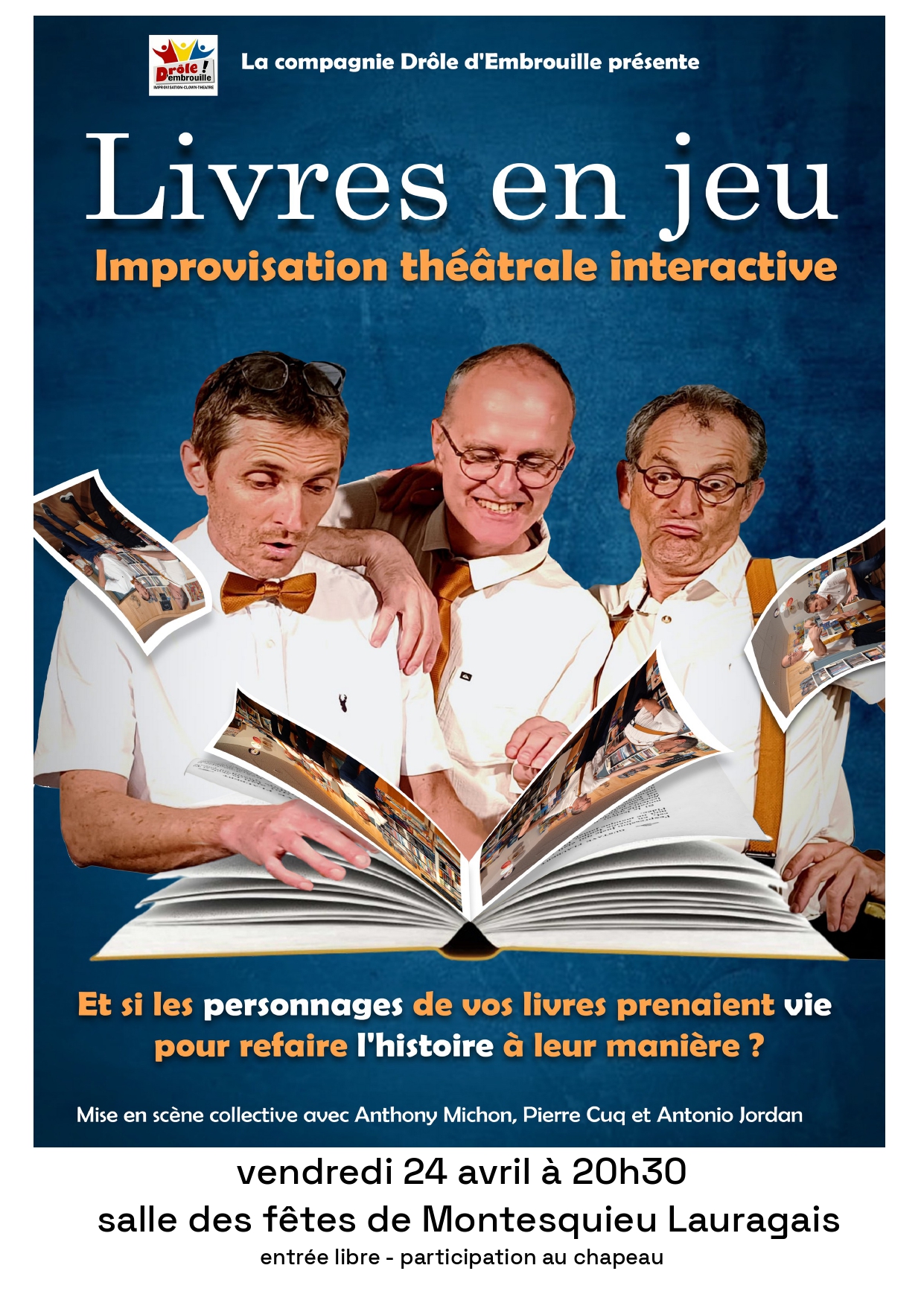 Soirée d'improVendredi 24 avril 2026Et si les personnages de vos livres prenaient vie pour réinventer l'histoire sous vos yeux ? À partir de suggestions du public, les comédiens construisent des scènes inédites, pleines d'humour, de surprises et d'interactions. Chaque représentation est unique. Mis en scène collectivement par Anthony Michon, Pierre Cuq et Antonio Jordan, ce spectacle promet un moment convivial et accessible à tous. |