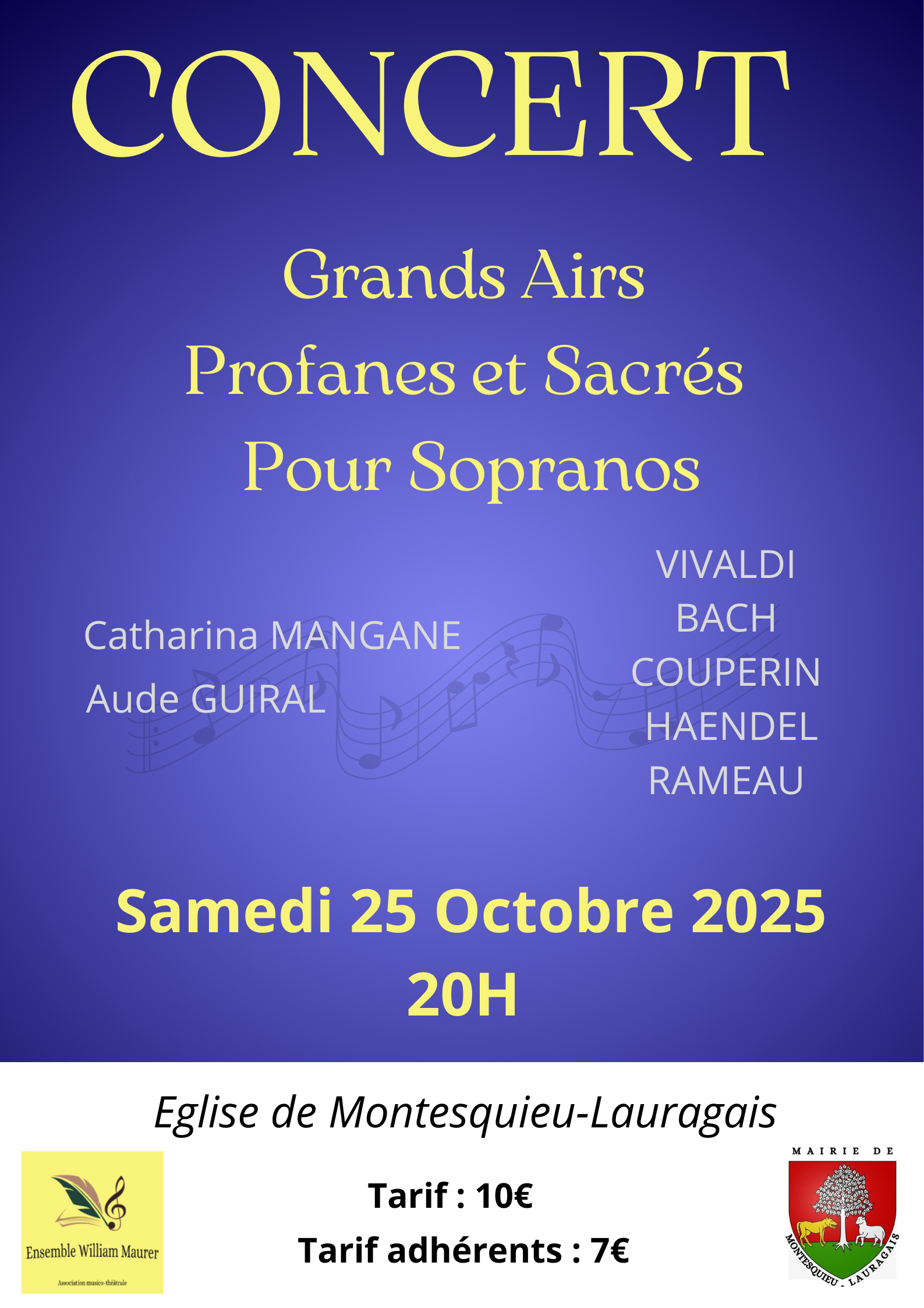 🎶Concert 🎶Samedi 25 octobre 2025Ne manquez pas à 20h, à l’église, un magnifique concert consacré aux grands airs profanes et sacrés pour sopranos. Les chanteuses Catharina Mangane et Aude Guiral interpréteront des œuvres de Vivaldi, Bach, Couperin, Haendel et Rameau, dans une ambiance pleine d’émotion et d’élégance.